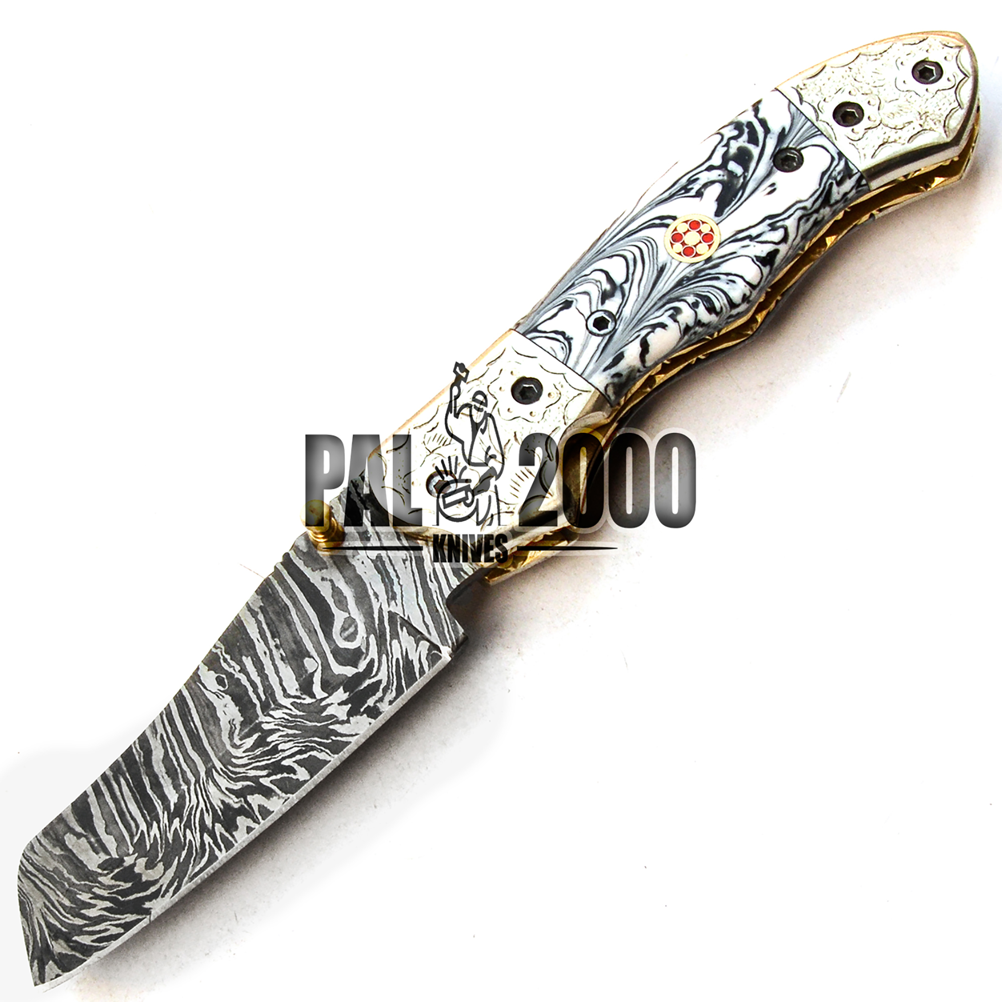 Beautiful Damascus Steel Folding Pocket Knife Top Quality And Leather Sheath