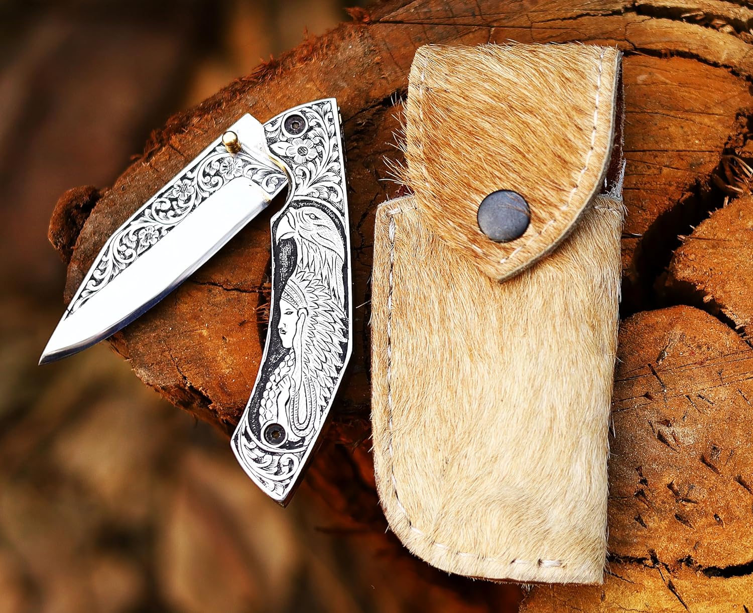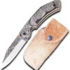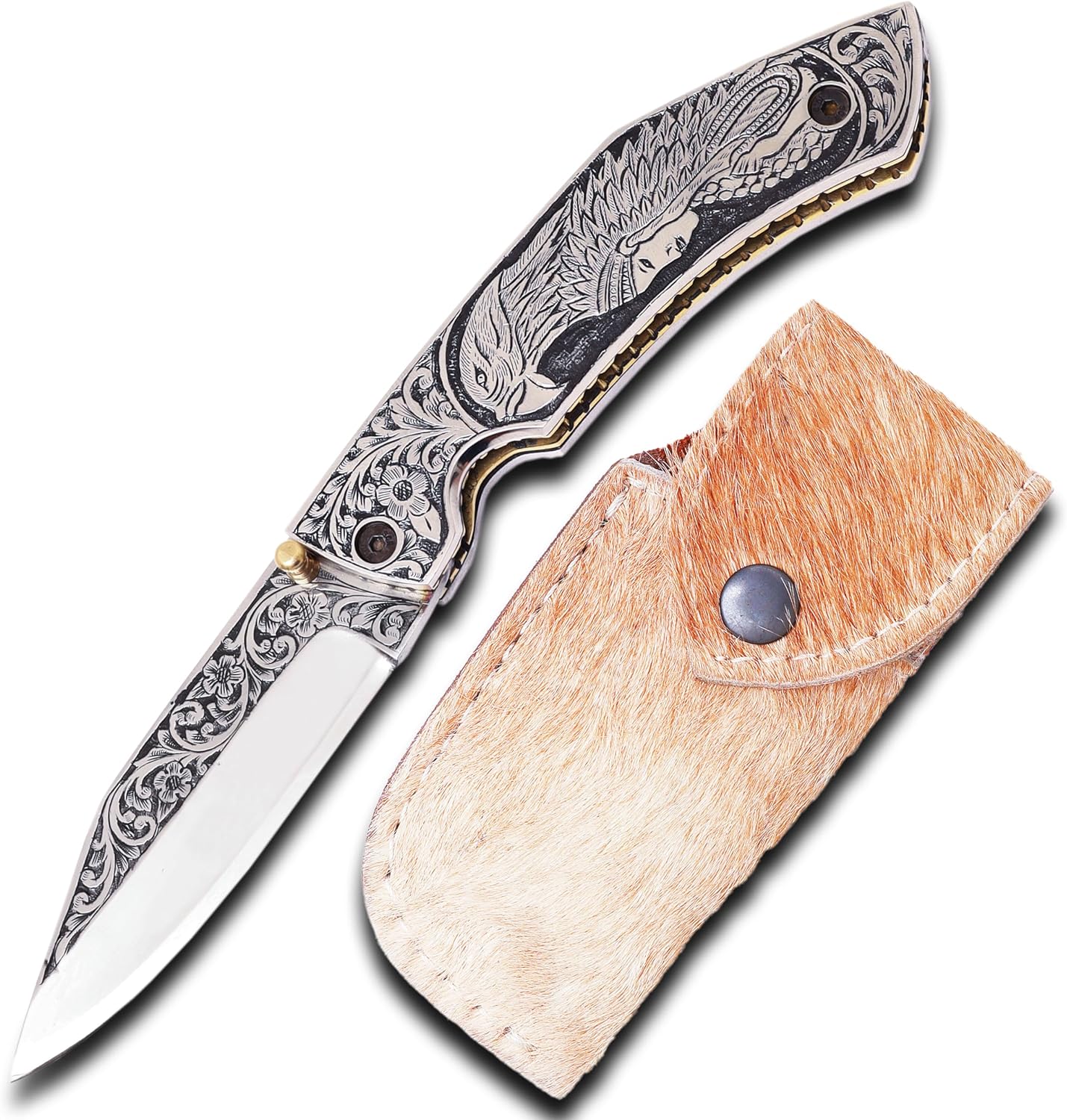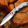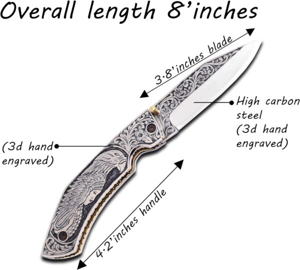 3D HAND ENGRAVED KNIFE – D2 steel handle with amazing art on the knife. Total length: 8 inch. Blade length: 3.8, handle 4.2, sharp, folding blade knife with natural leather case of deer or mountain sheep in random colours.This knife is made with a stunning design of D2 steel blades in beautiful hand forged designs. The D2 knife has a high quality content to offer exceptional edge and sharp ability. The blade hardness of this knife is 58-60 HRC in the laboratory and is hand sharpened to a sharp edge. High quality durable leather hands with cowhide leather. Buy safely and certifies that you are 18 and that you are able to legally buy and use an item responsibly.The handle of this knife is crafted from high-quality wood, which not only adds a touch of elegance but also ensures a firm grip. The folding mechanism is secured with a reliable lock, making the knife safe to carry in any outdoor adventure. Its compact design allows for easy portability, making it an excellent everyday carry (EDC) option. This knife is more than a tool; it is a personalized weapon that resonates with the spirit of the outdoors. The intricate details, the beautiful pattern on the making it an essential piece of equipment for any hunter or outdoor enthusiast. This custom handmade folding pocket knife can also serve as a throwing knife, adding another level of functionality. Its durability and resilience make it an excellent choice for those who enjoy hiking, camping, or any outdoor activities. This knife is under 6 inches, making it legal to carry in most places. In conclusion, this folding knife is a blend of quality, beauty, and utility. It’s not just a knife; it’s an engraved piece of history that you can carry in your pocket. Whether you’re buying this as a gift or adding it to your personal collection, this knife is sure to impress.