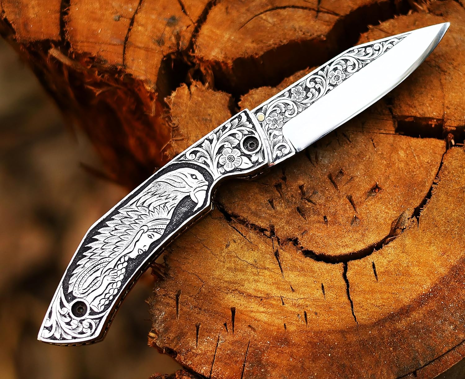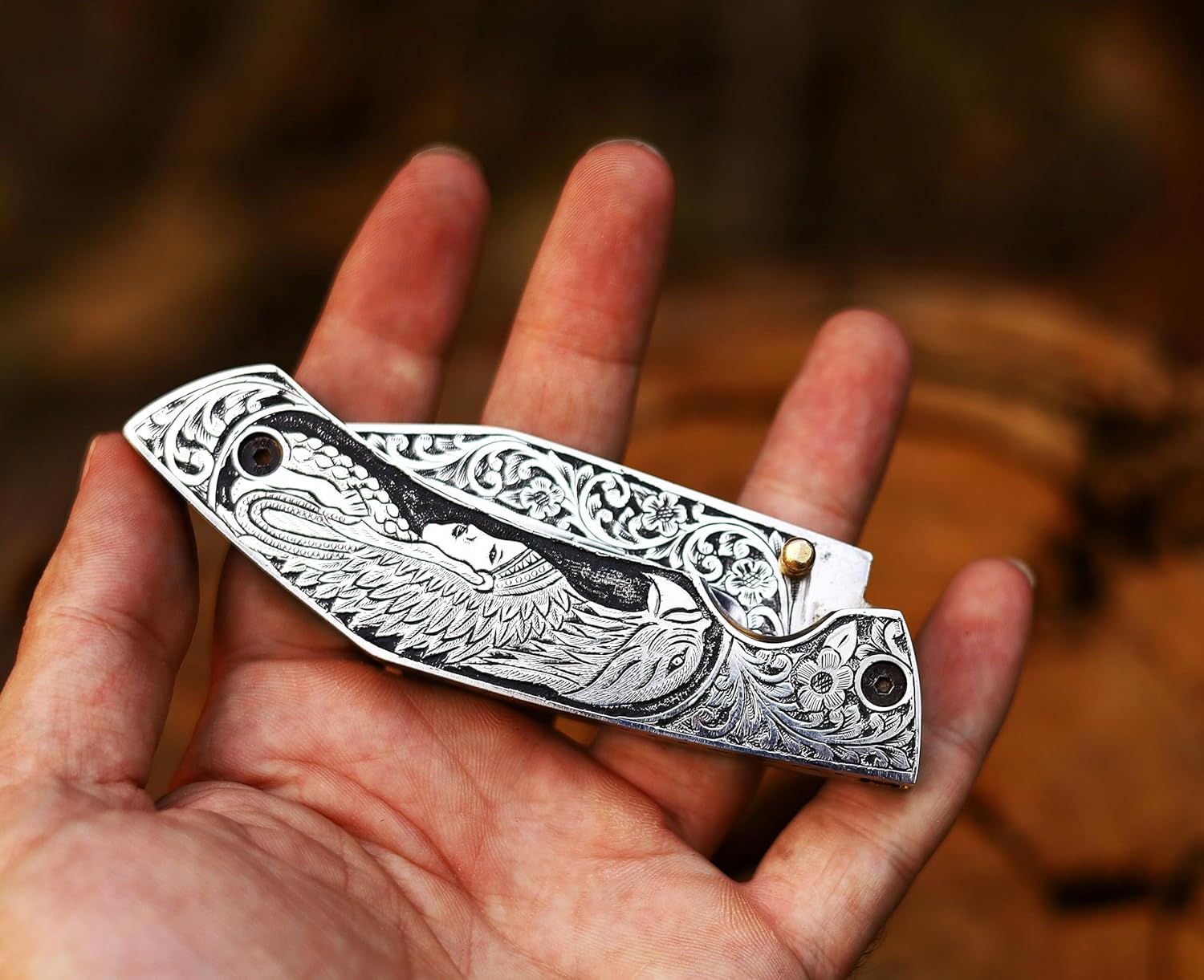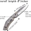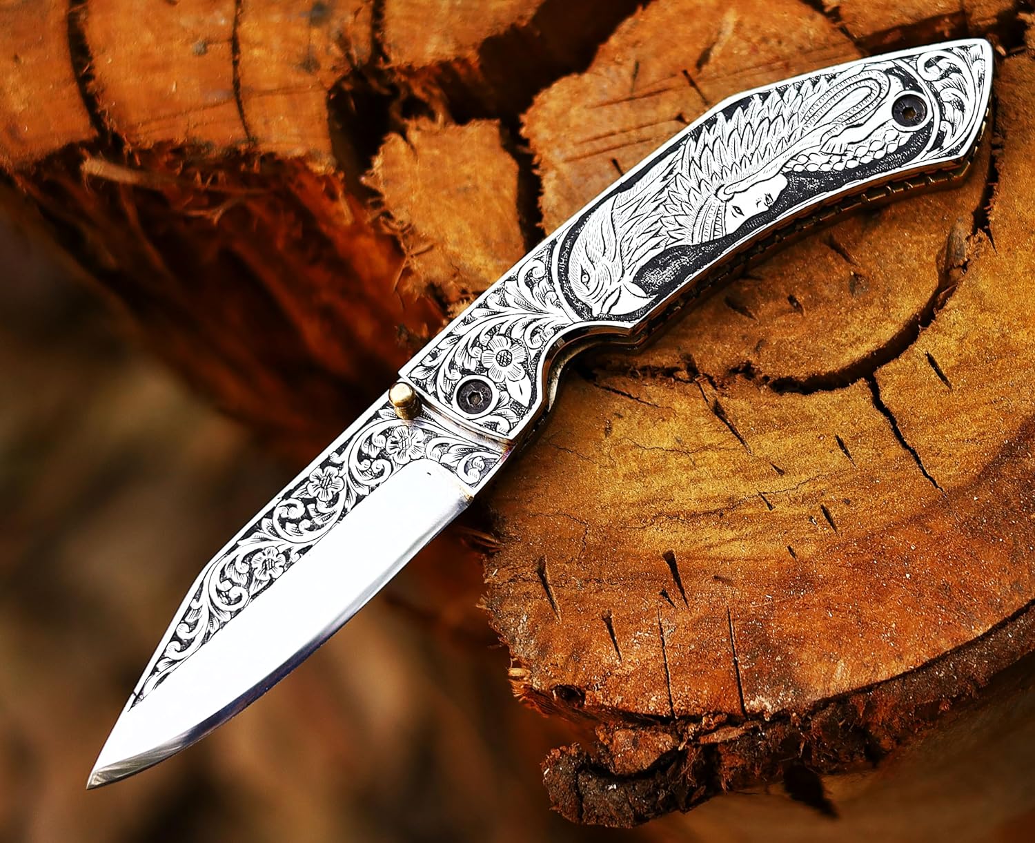 3D HAND ENGRAVED KNIFE – D2 steel handle with amazing art on the knife. Total length: 8 inch. Blade length: 3.8, handle 4.2, sharp, folding blade knife with natural leather case of deer or mountain sheep in random colours.This knife is made with a stunning design of D2 steel blades in beautiful hand forged designs. The D2 knife has a high quality content to offer exceptional edge and sharp ability. The blade hardness of this knife is 58-60 HRC in the laboratory and is hand sharpened to a sharp edge. High quality durable leather hands with cowhide leather. Buy safely and certifies that you are 18 and that you are able to legally buy and use an item responsibly.The handle of this knife is crafted from high-quality wood, which not only adds a touch of elegance but also ensures a firm grip. The folding mechanism is secured with a reliable lock, making the knife safe to carry in any outdoor adventure. Its compact design allows for easy portability, making it an excellent everyday carry (EDC) option. This knife is more than a tool; it is a personalized weapon that resonates with the spirit of the outdoors. The intricate details, the beautiful pattern on the making it an essential piece of equipment for any hunter or outdoor enthusiast. This custom handmade folding pocket knife can also serve as a throwing knife, adding another level of functionality. Its durability and resilience make it an excellent choice for those who enjoy hiking, camping, or any outdoor activities. This knife is under 6 inches, making it legal to carry in most places. In conclusion, this folding knife is a blend of quality, beauty, and utility. It’s not just a knife; it’s an engraved piece of history that you can carry in your pocket. Whether you’re buying this as a gift or adding it to your personal collection, this knife is sure to impress.